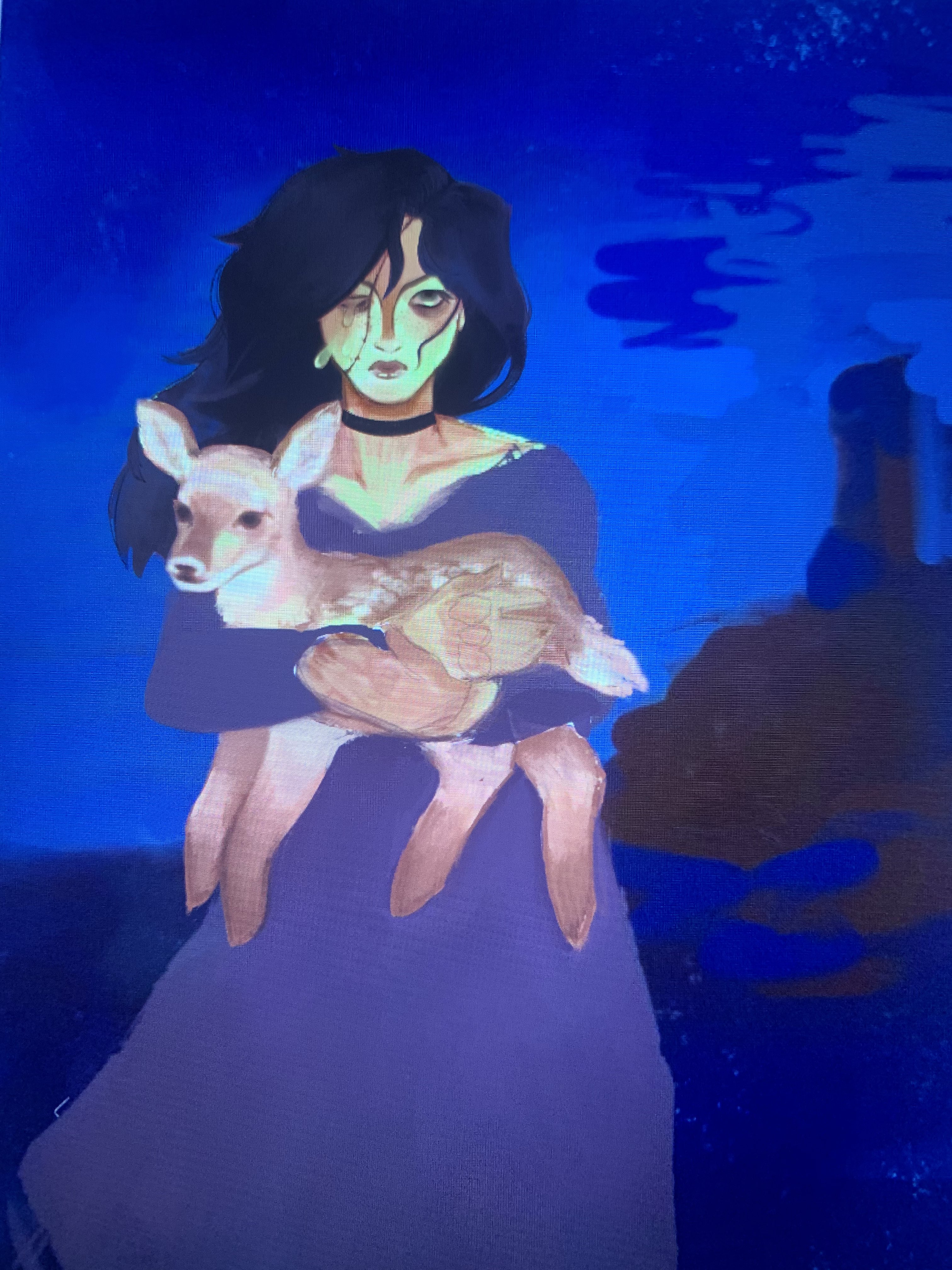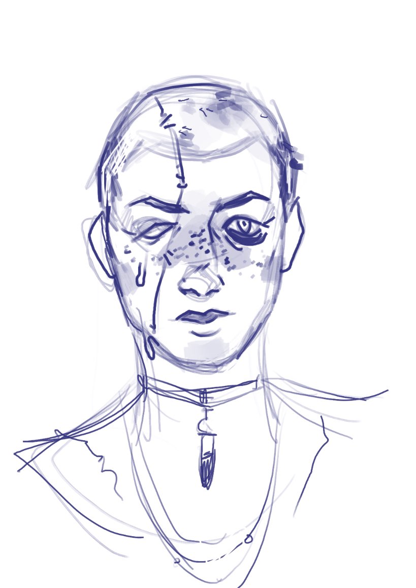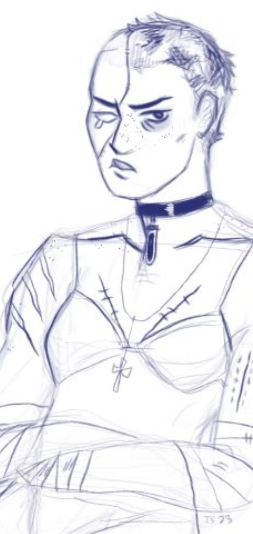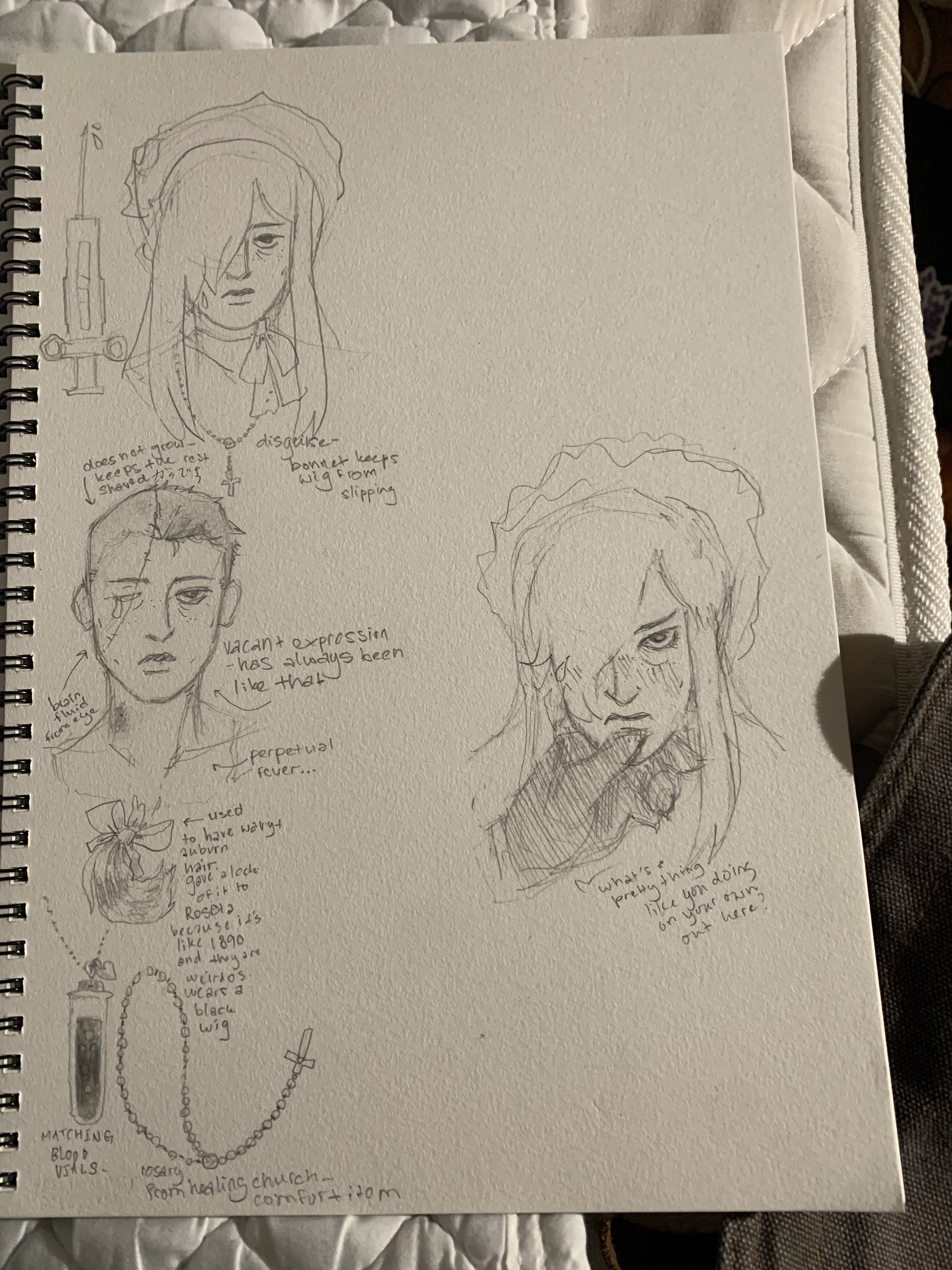 Ex blood saint currently escaping from the healing church. Very rude and judgemental towards people, behaves like a feral cat. Can get very clingy towards roseta while being mean and "tough". Very sickly overall, for everyday use uses a cane (with a gun inside of it). Has a very sweet tooth. Very ladylike due to her upbringing, she doesn't like to mention her family at all. Due to her past with the healing church she had to perform self-surgery which leaves her with a permamently "crying" right eye. Generally dresses in goth outfits/dresses.